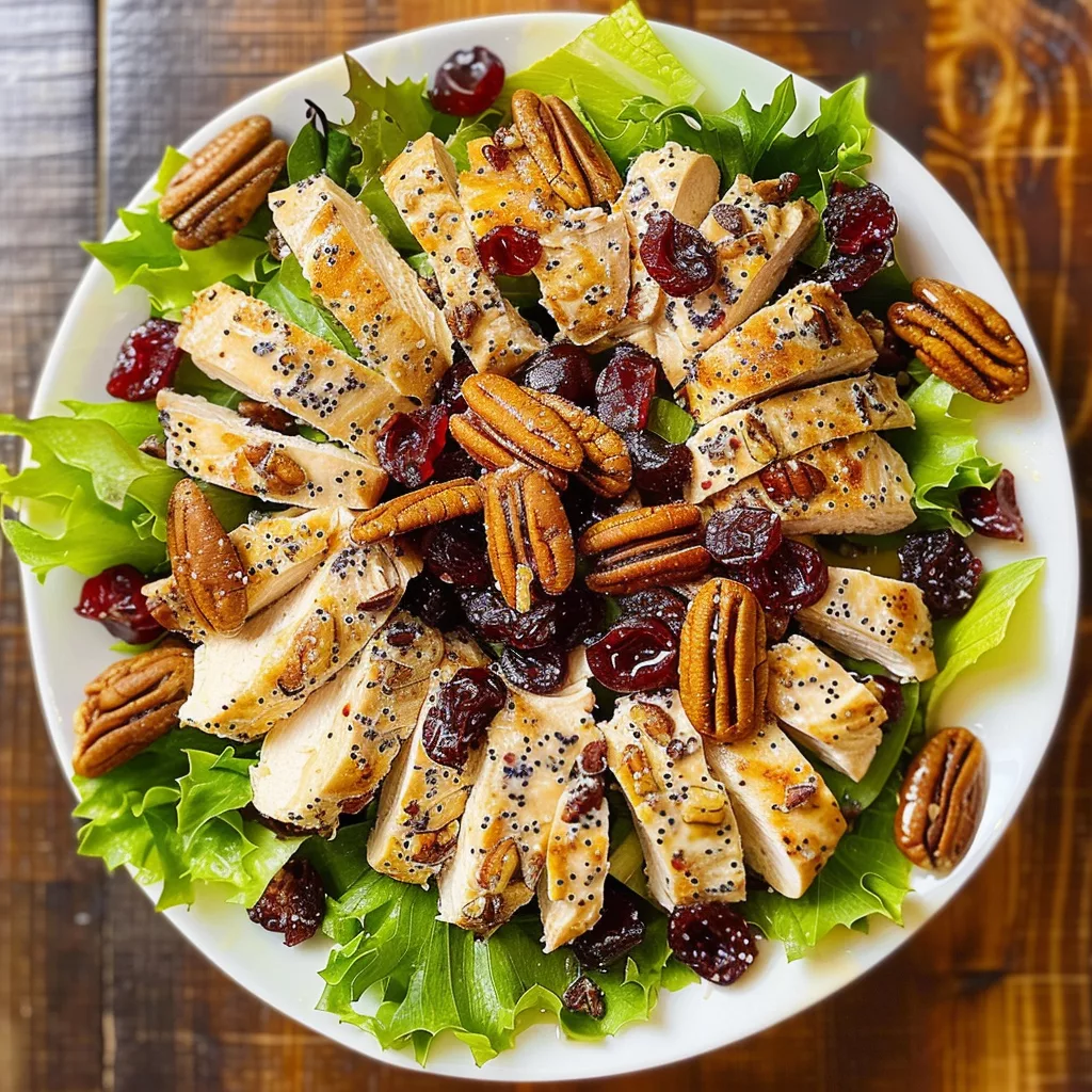 A flavorful, crunchy, and creamy chicken salad featuring tart cranberries, toasted pecans, and a bright poppy seed dressing. This refreshing dish is perfect for lunch or meal prep.