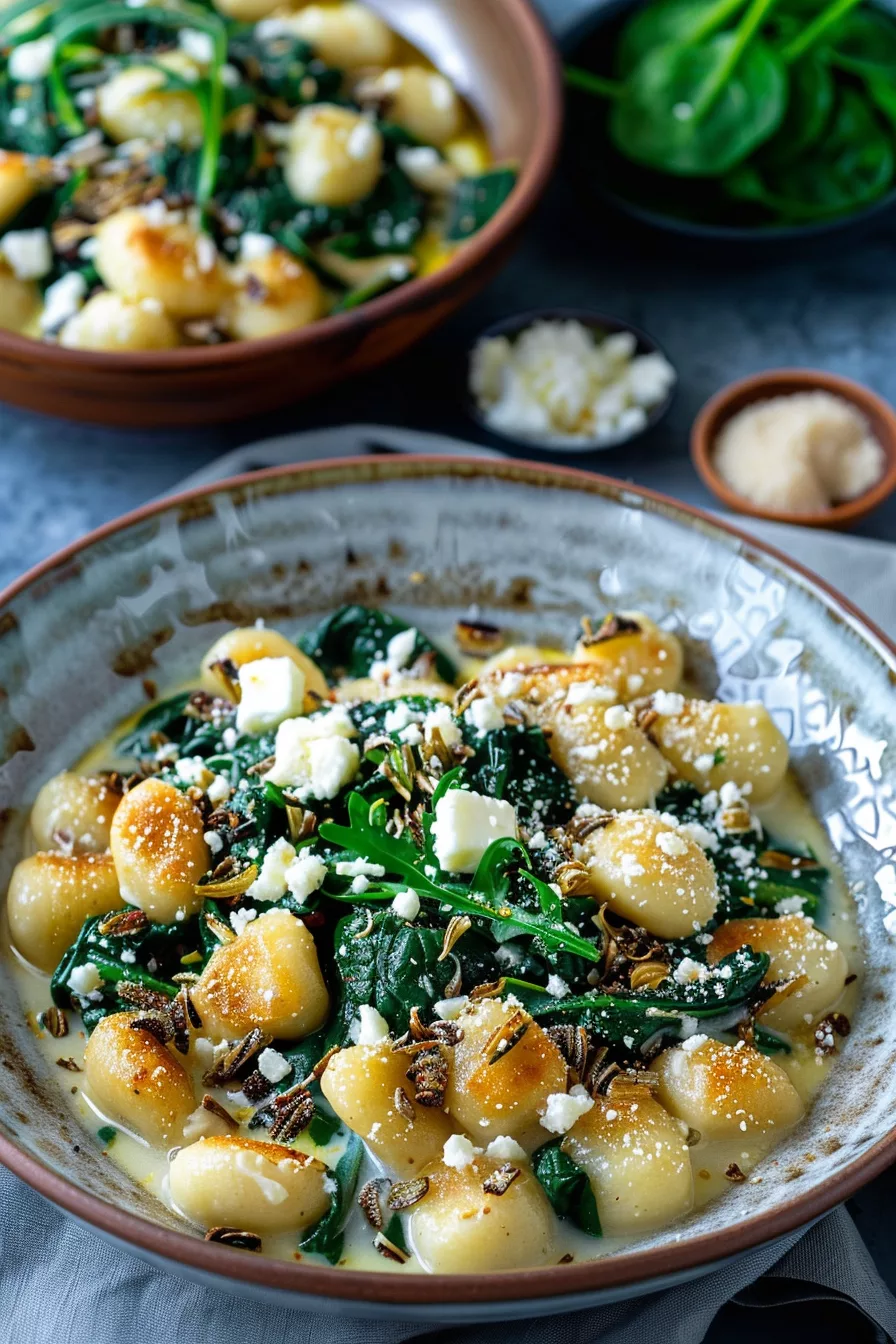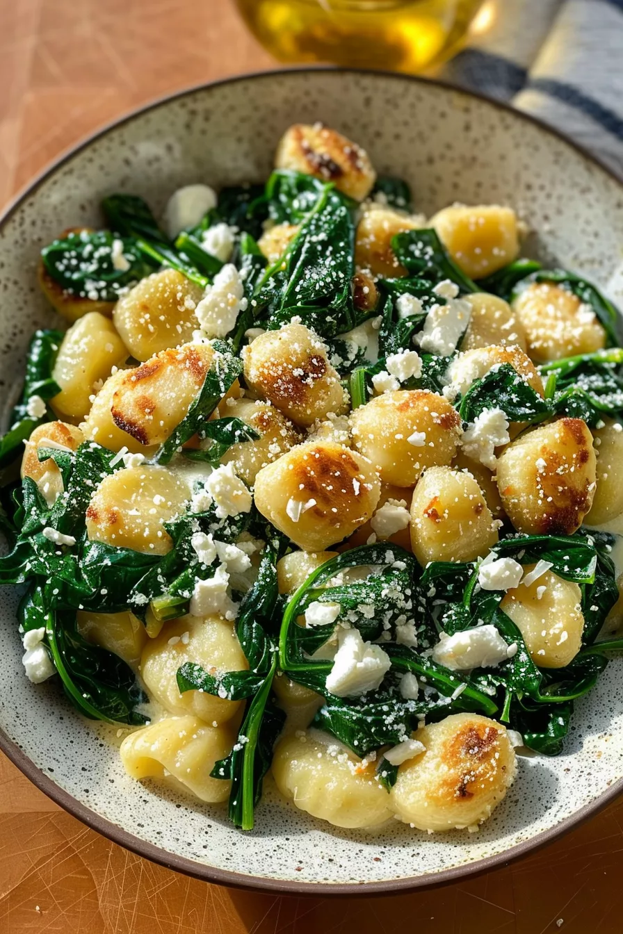 A velvety and herbaceous pasta dish featuring pillowy gnocchi, tender spinach, and tangy feta in a rich dairy-based sauce. Perfect for a satisfying and flavorful Italian-inspired meal.