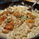 A comforting one-pot meal with golden-seared chicken in a velvety garlic herb sauce served over fluffy rice. The chicken absorbs rich broth for a deeply savory, restaurant-quality experience with minimal effort.