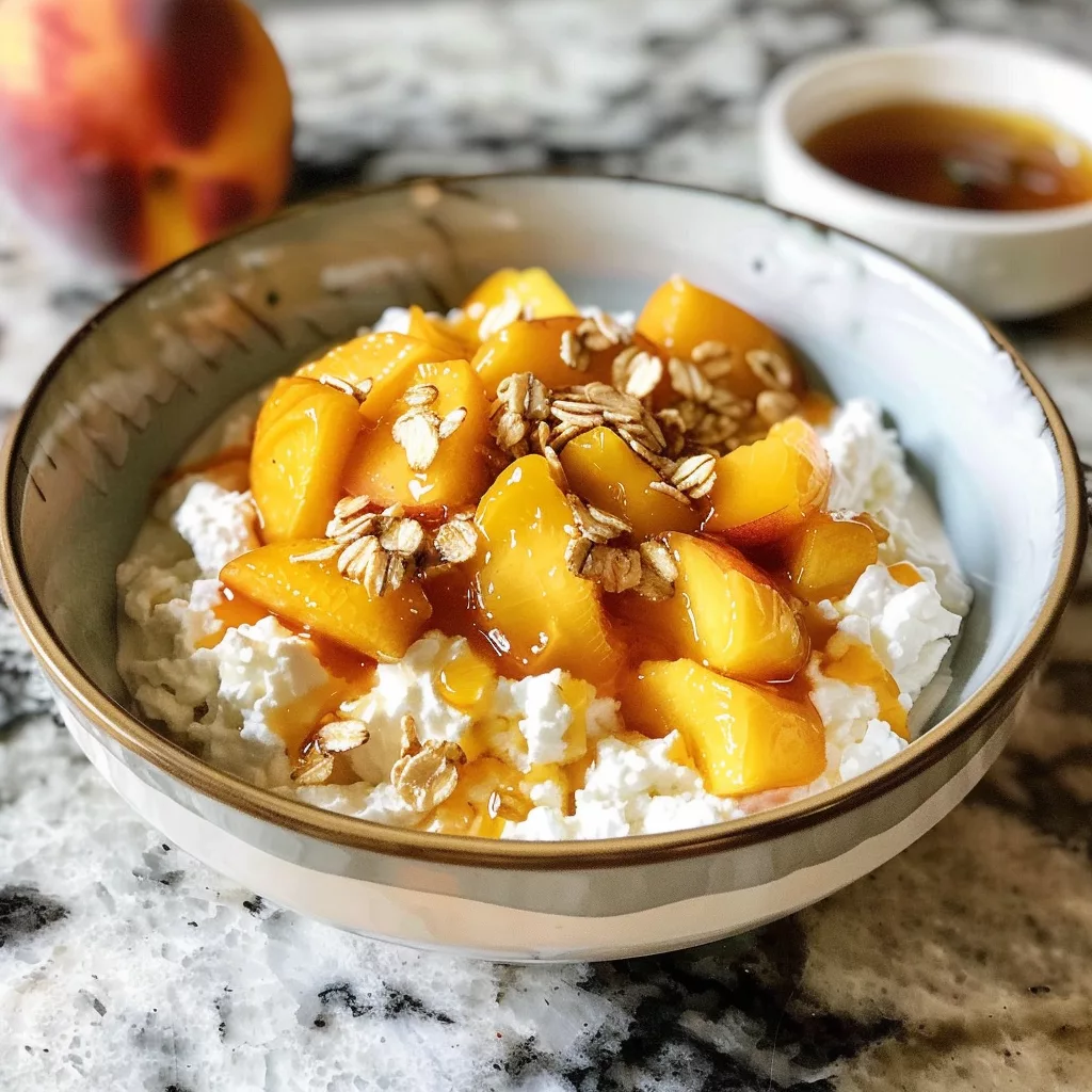 A protein-packed breakfast bowl that combines creamy cottage cheese with warm cinnamon-spiced peaches and crunchy toppings for a satisfying, dessert-like start to your day without refined sugars or heavy carbs.