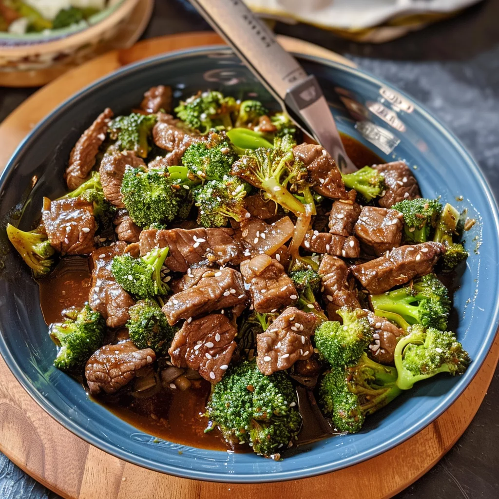 Tenderized flank steak stir-fried with crisp broccoli in a savory, umami-rich sauce. A nutritionally balanced main course with high protein and essential vegetables.